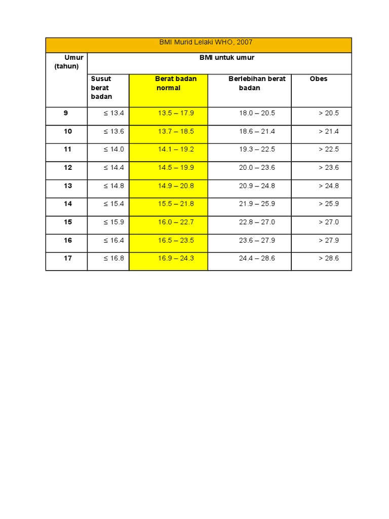 Jadi bersamaan dengan 420. Pengelompokkan hasil BMI telah menjadi standar dan ditetapkan oleh WHO. Kanak-kanak umur 2 tahun 10 bulan.